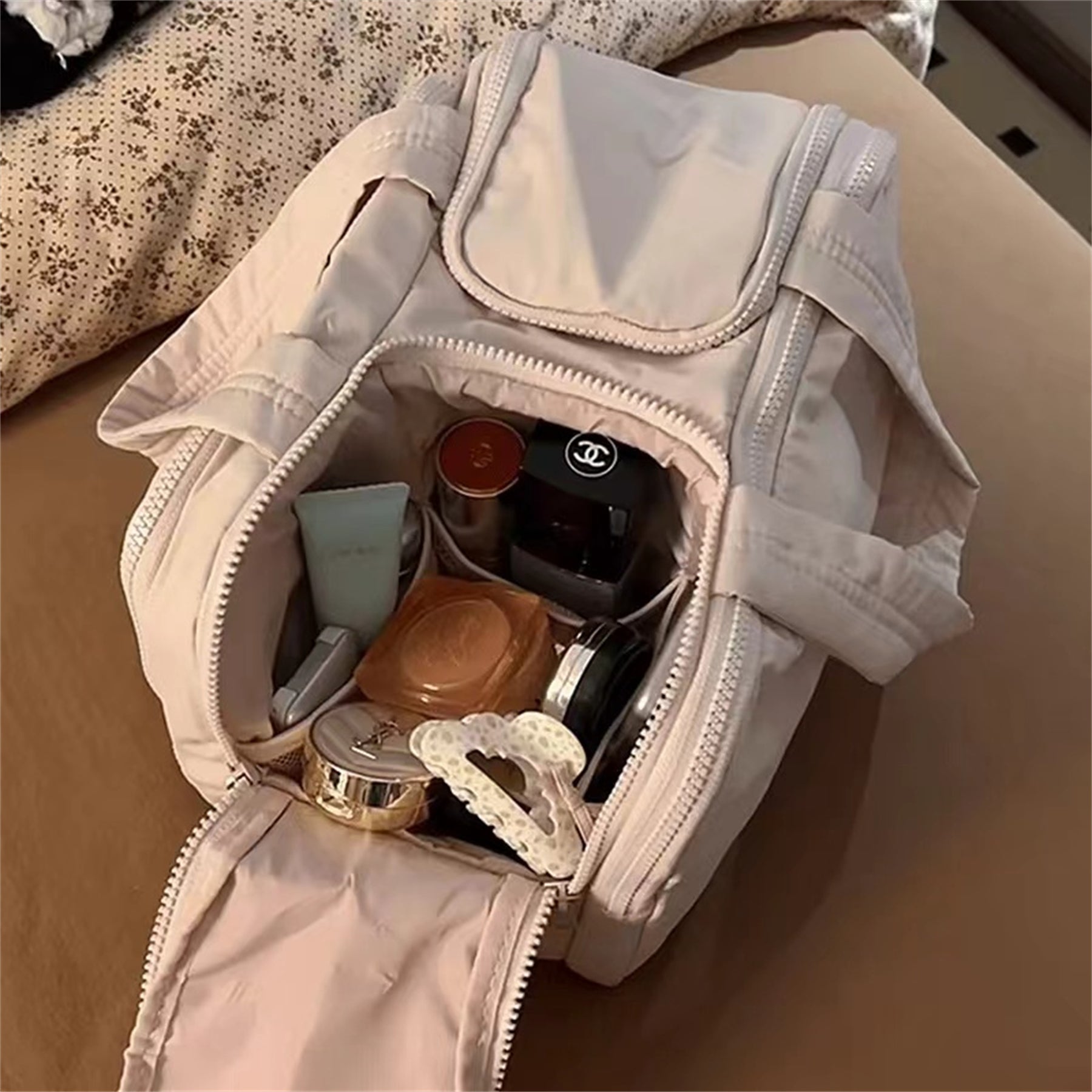 Reported easier organization of cosmetics during recent trips with this spacious bag.